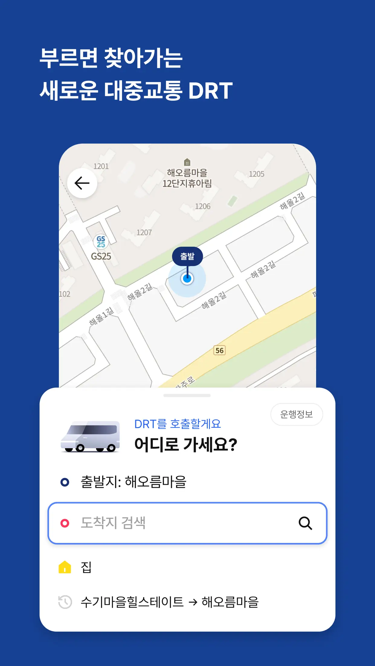 정해진 노선이나 시간표 없이 앱 또는 전화로 호출하면 가까운 정류장으로 버스가 도착해요.